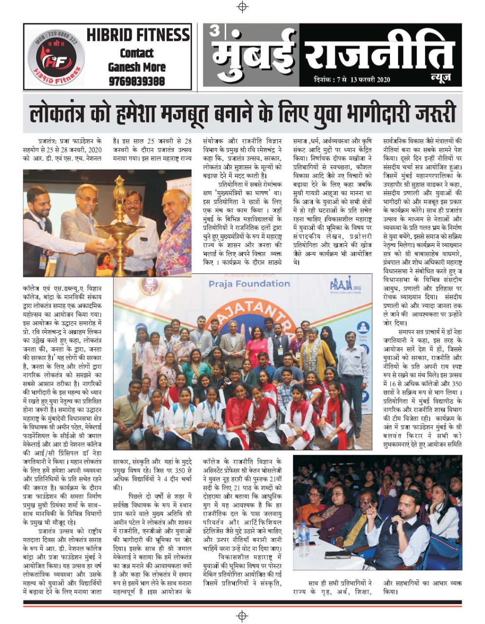 प्रजा फाउंडेशन के सहयोग से २५ से २८ जनवरी,२०२० को आर.डी. एवं एस एच. नेशनल काँलेज एवं एस. डब्ल्यु.ए. विज्ञान काँलेज, बांद्रा के मानविकी संकाय द्वारा लोक तंत्र सप्ताह एक अकादमिक महोत्सव का आयोजन किया गाया|